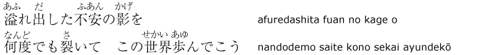 | 立ち止まっても [tachidomattemo] | Even if I am stranded 立ち止まる [tachidomaru]: to halt, to stand still = 立つ [tatsu]: to stand + 止まる [tomaru]: to stop + ても [temo]: even if |